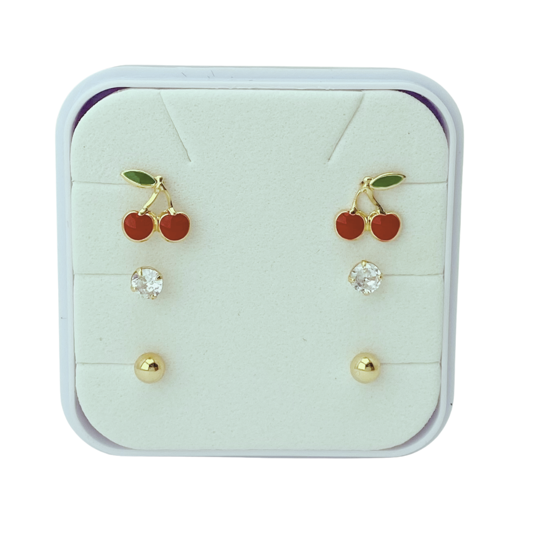 O conjunto conta com três pares de brincos — cereja, pedrinha, bolinha — permitindo diferentes combinações de acordo com o look e a ocasião. Um toque delicado e elegante que completa o visual dos pequenos com muito charme.